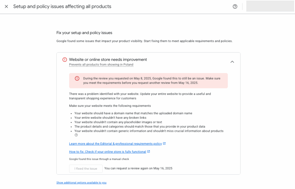 Submitting a review request before fully fixing all issues can result in irreversible account suspension. In that case, there will be no way to restore your product visibility in Google Ads using the same store domain.